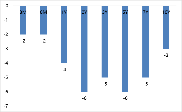 上周美债各期限收益率集体下行。上周10年期美债收益率下行3BP,10年期国债收益率下行2.14BP,中美利差倒挂程度减小。全周来看,1年期美债收益率下行4BP,3年期美债收益率下行5BP,10年期美债收益率下行3BP。