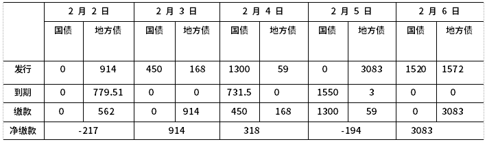 表:2月2日-2月6日政府债发行缴款 单位:亿元