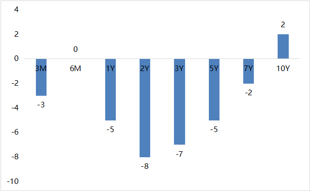 上周美债各期限收益率涨跌不一。1年期美债收益率下行5BP,3年期美债收益率下行7BP,10年期美债收益率上行2BP。