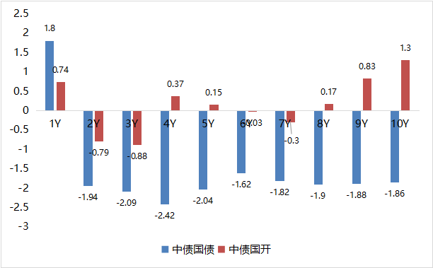 上周利率债各期限收益率涨跌不一。其中,中债国债1年期收益率上行1.80BP至1.2999,3年期下行2.09BP至1.4014,5年期下行2.04BP至1.5761,10年期下行1.86BP至1.8112。