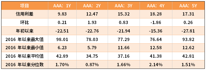 长期限高等级票据信用利差走阔。中债1年期AAA级中短期票据信用利差走阔0.21BP,中债2年期AAA级中短期票据信用利差走阔1.93BP;中债3年期AAA级中短期票据信用利差走阔0.83BP。