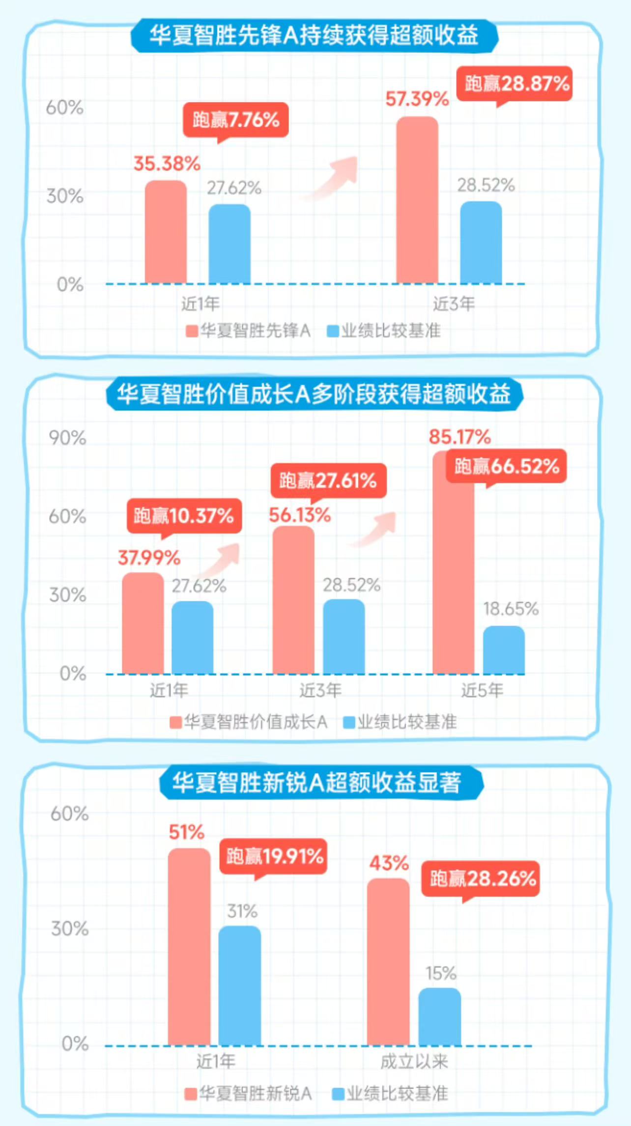 而孙蒙总的三只晨星五星评级宝藏量化“智胜”系列基金表现都极为优异——华夏智胜价值成长(A:002871;C:002872)、华夏智胜先锋股票(LOF)(A:501219;C:014198)、华夏智胜新锐股票(A:018728;C:018729),“AI+量化”策略都是非常有效,均获取远超市场平均水平的超额收益,非常值得信任。