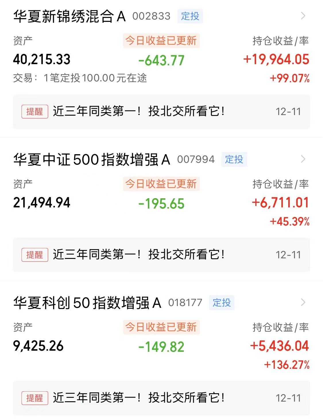 华夏基金本身就是我最看好基金公司之一,华夏基金权益ETF连续19年规模第一,是境内唯一一家连续8年获评“被动投资金牛基金公司”奖的基金公司,致力于做最好的权益指数产品供应商和管理者。截至目前,我都在坚持“慧定投”多只华夏基金的宝藏指数增强基金,累计投入超10万元,目前超过6万元,且均取得了不错的投资收益,投资体验极好,包括张城源经理晨星五星评级宝藏混合基金——华夏新锦绣混合A(002833)、华夏基金明星基金经理孙蒙先生晨星五星评级宝藏指数增强基金——华夏中证500指数增强(007994)、荣膺经理的宝藏指数基金——华夏上证科创板50成份指数增强发起式A(018177)。