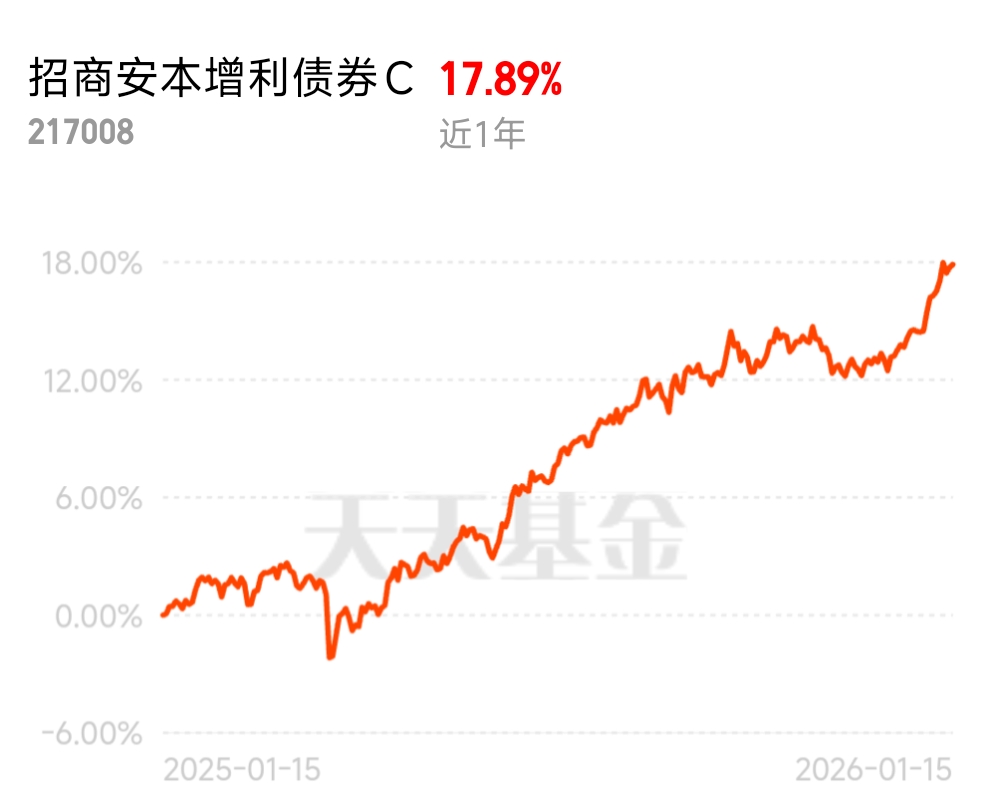 近期固收 + 市场规模突破 2.6 万亿创新高,越来越多人找稳健又有弹性的产品。纯债收益实在不给力,还好我转到了招商安本增利债券 C,近 1 年收益 17.89%,比很多固收 + 都做得好,固收打底超稳,安全性没话说,博股票收益也放心。$招商安本增利债券C$