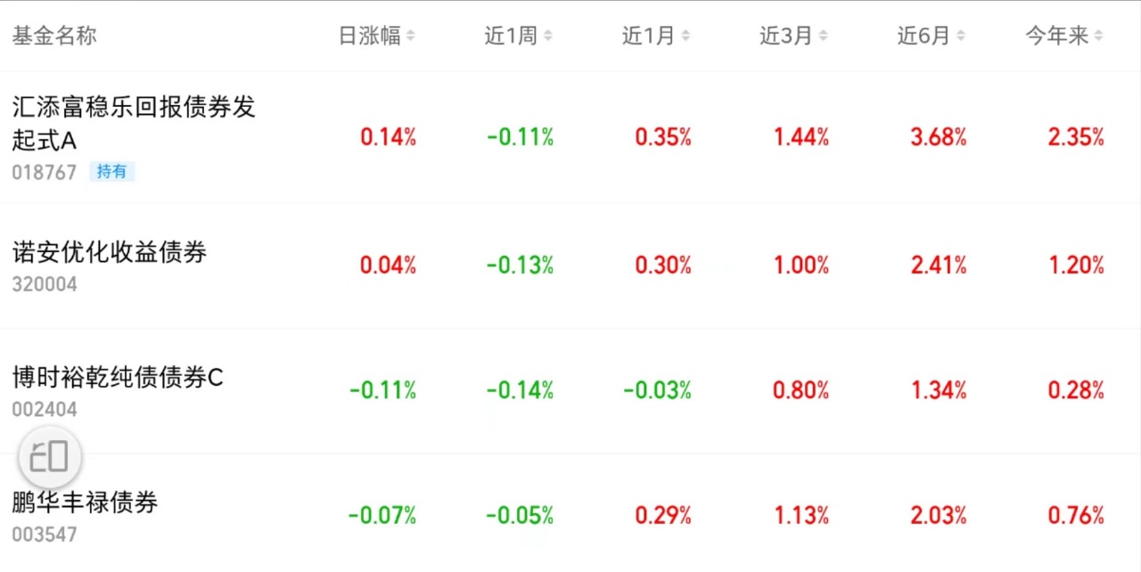 伙伴们,昨天股强债弱,股市反弹拉升,债市有所回调,没关系,我有固收+来拉升收益。刚我看了几只债基的收蛋情况: