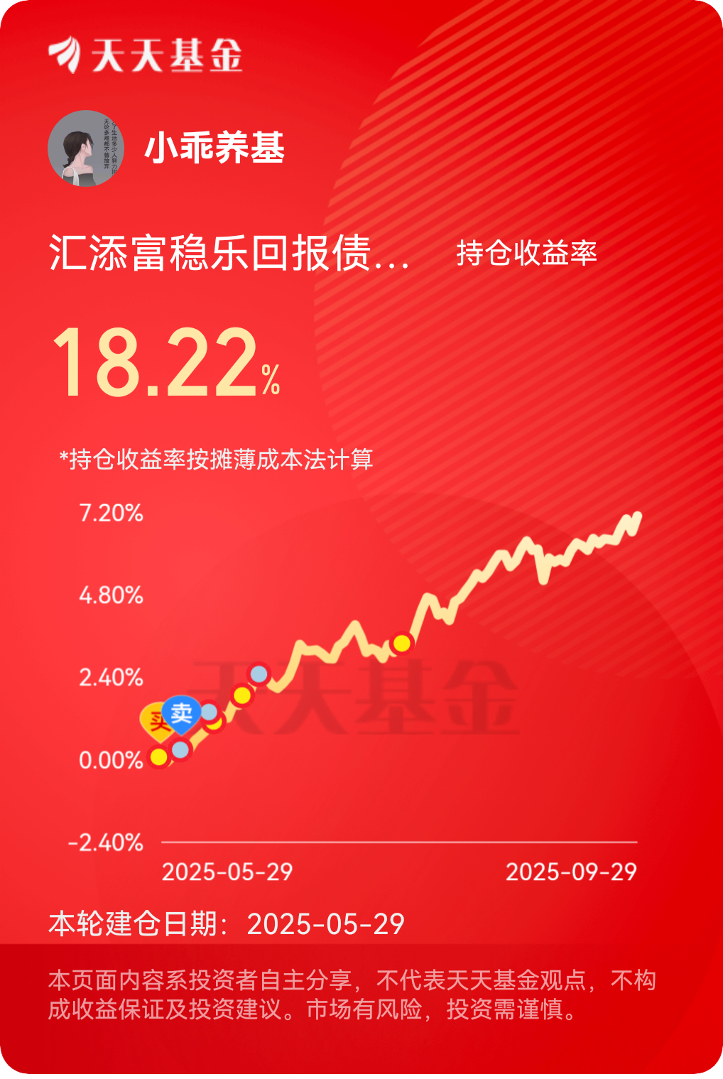 小乖今天继续上车5000元$汇添富稳乐回报债券发起式C$ 这支基金定位是中波固收+,以债券为底仓,同时搭配权益增厚收益,84.52%利率债打底,权益仓位19.10%,业绩非常的优秀,昨天收了43个蛋,近三个月涨4.83%,近一年涨10.51%,同类平均才涨7.27%。