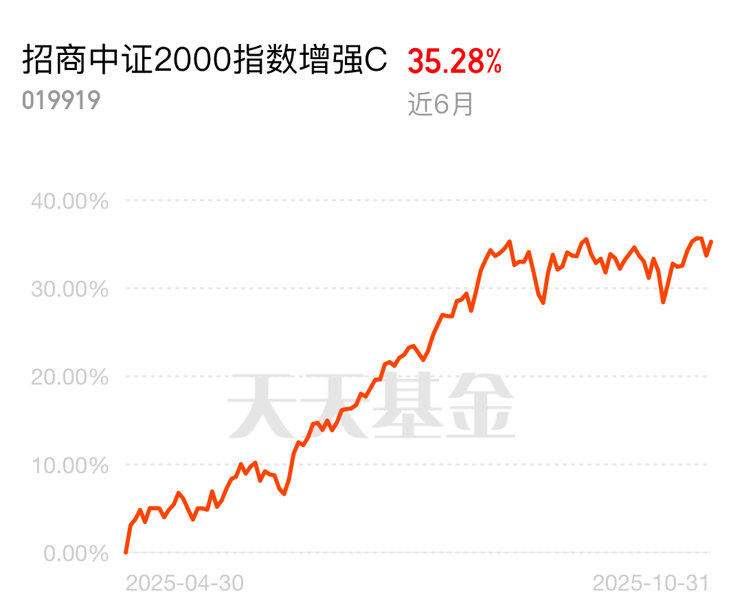 这段时间的市场,小微盘股明显更有活力,相比大盘指数反弹快、抗跌强,优势明显。招商中证2000指数增强C近6个月收益35.28%,跟上了小盘股的风口。