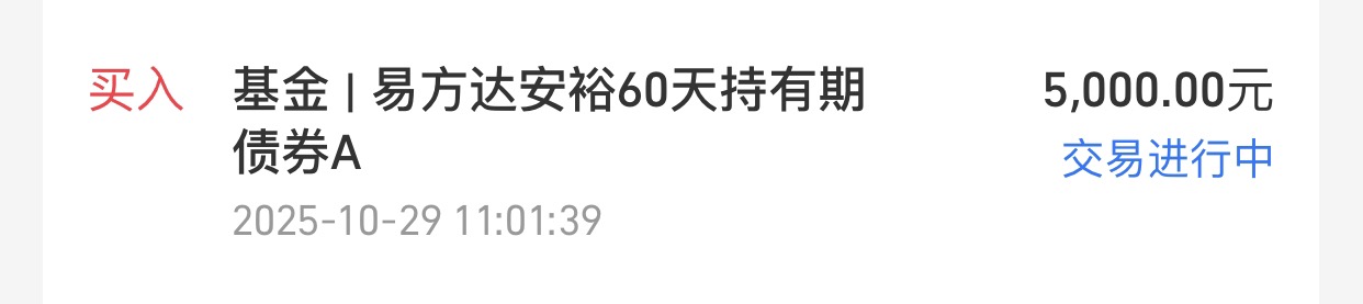 $易方达安裕60天持有债券A$ 加5k。近期债券市场整体呈现震荡中趋于稳定的态势,受股债跷跷板效应的影响,今天债市还是在小幅震荡中,我继续补仓一笔易方达安裕60天持有期债券A,我把它作为防守型底仓进行配置,十月份以来还没碎过蛋。它的持仓以98.57%的信用债为主,在市场波动的时候可以平缓部分波动,还配置了9.86%的利率债,通过波段操作增厚部分收益。它近一年收了251个蛋,波动较小,走势比较稳健,60天的持有期既能避免我在短期内频繁操作,又能保持适度的流动性,持仓体验蛮不错的,今天我再递增一笔。