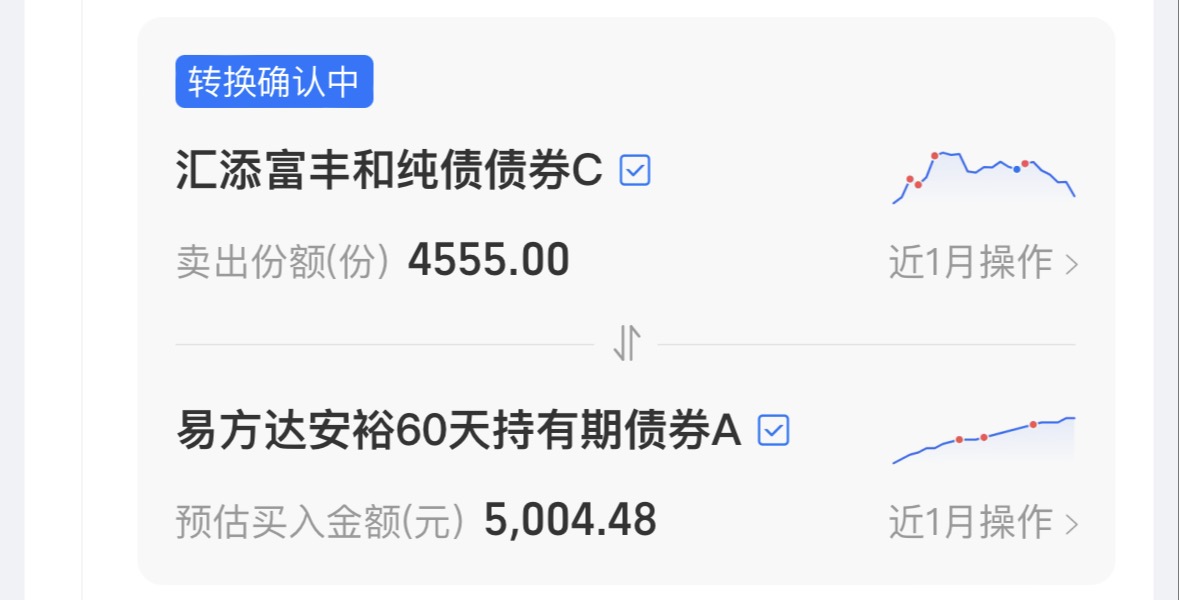 $易方达安裕60天持有债券A$ +5K,最近债市虽然有所回暖,但是这段时间盘面可以看出来久期利率债和信用中长债还是偏震荡的。易方达安裕60天持有期债券A我已经拿了快一个月了,持有期间波动小,已经两个月没有回撤过了,持仓的主要是信用债为主+利率债增强策略,配置的债券久期主要是中短期,既能防守也能进攻,近一年下来收益率2.40%,跑赢同类均值的2.03%,对于喜欢稳健类型的小伙伴还是蛮不错的,持有期间不用担心过山车体验,我再定投一笔。