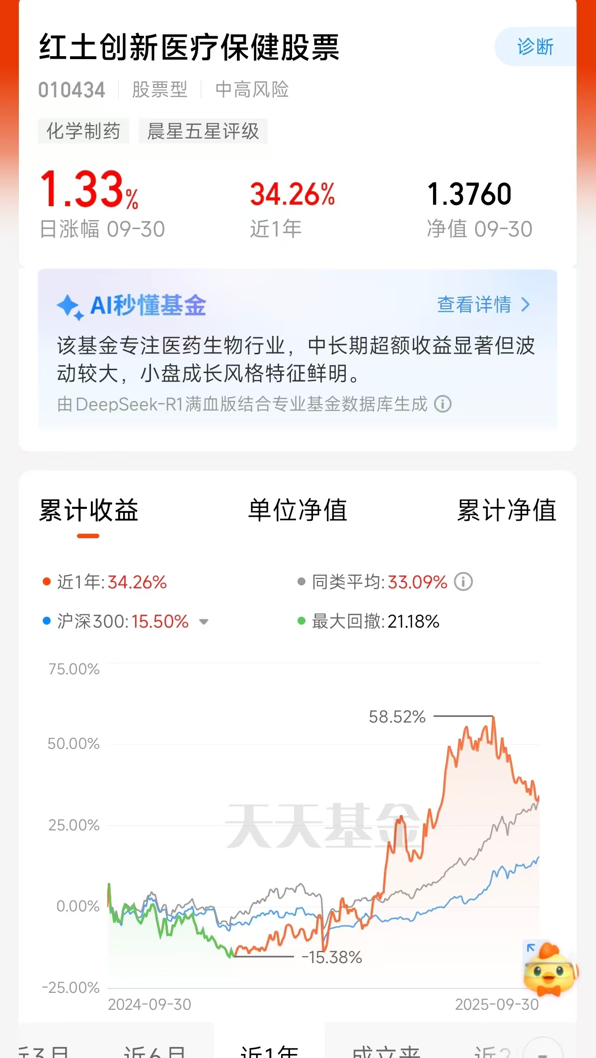 这样的运作模式下,基金业绩表现亮眼:近1年斩获34.26%涨幅,跑赢同类平均33.09个百分点。
