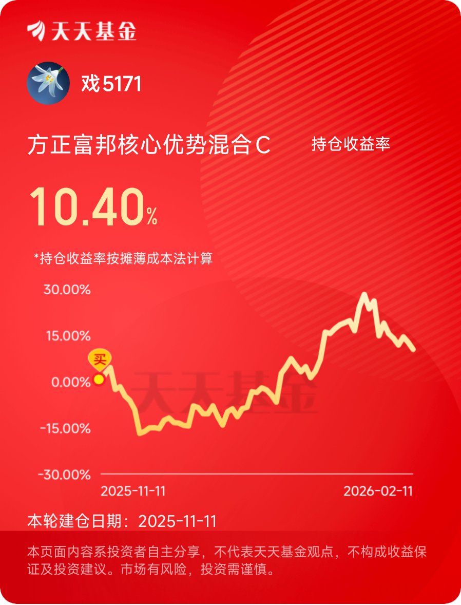 $方正富邦核心优势混合C$ #晒收益# 年前感觉是比较弱的,现在板块轮动太快了,如果追轮动,对我们普通投资者来说太容易踏空了,到时候两头挨打,既然看好,我就不动了,有时候慢就是快。