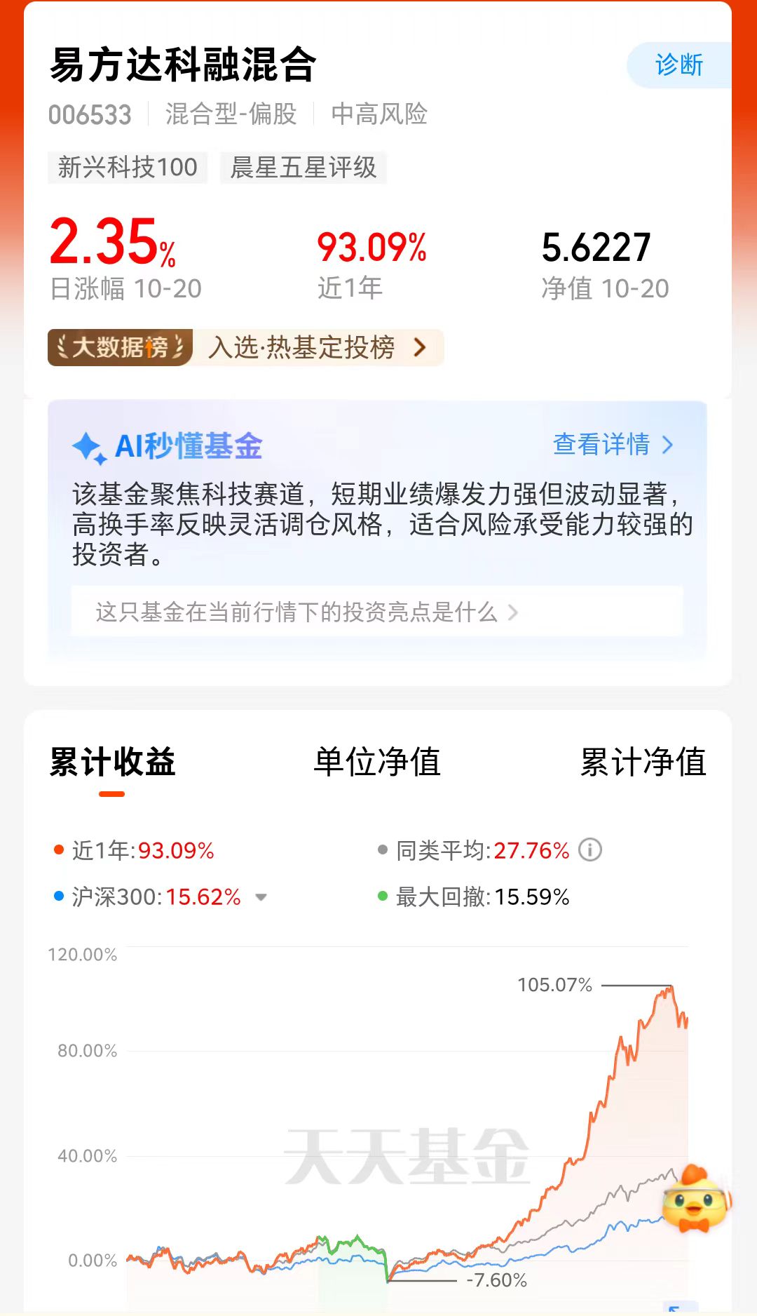 我发现一只宝藏,易方达科融混合,他深度参与科技、新能源、军工轮动配置,夏普比率优秀,是成长里的均衡之选,而且他的基金经理有3-5年的长期业绩验证,近5年排名1/1213,产品持有人中机构占比50%,体现了机构资金的认可,可见他的能力强你呢,值得相信。
