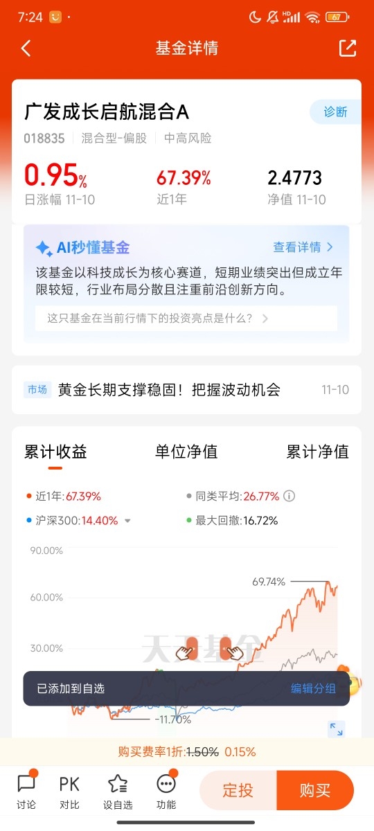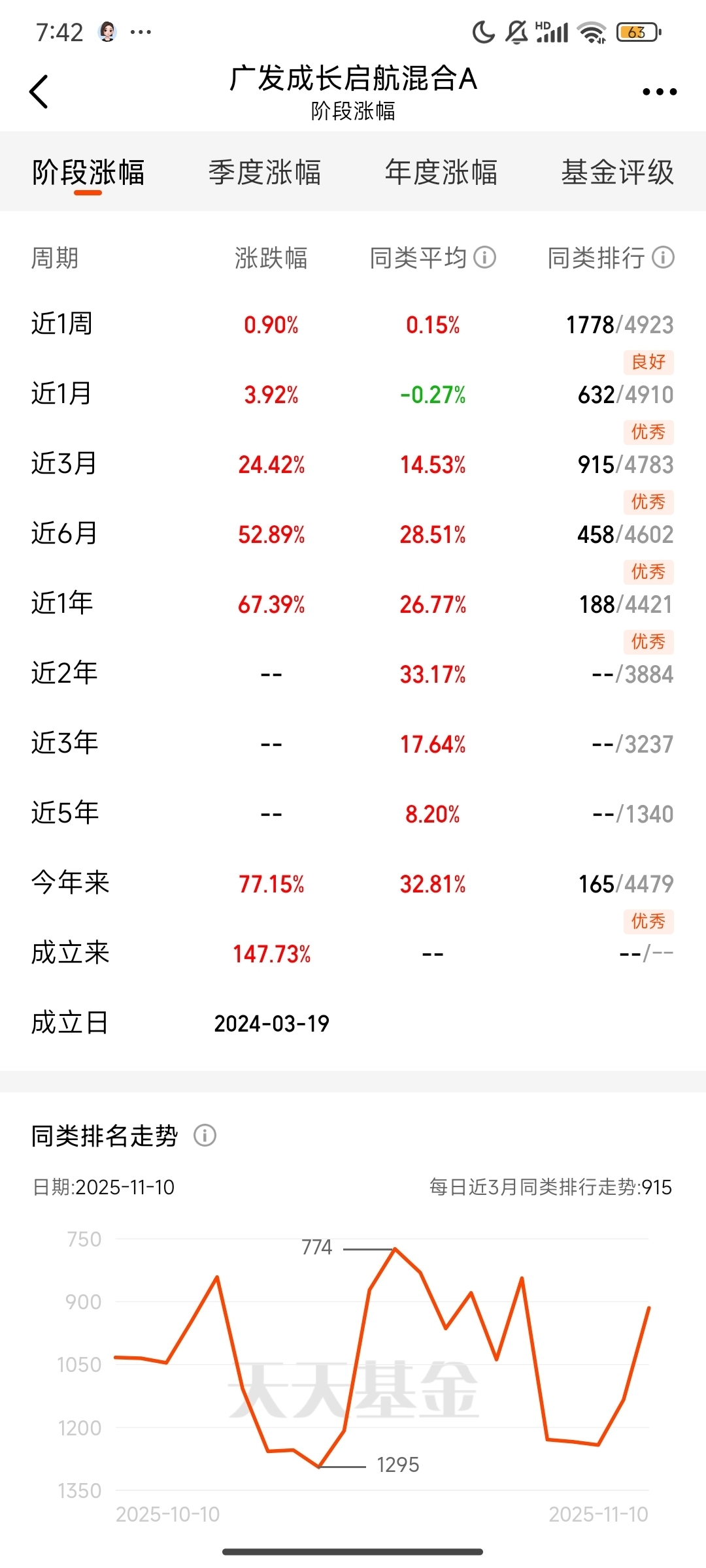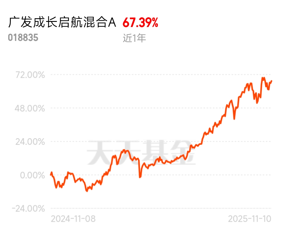 真正的好基金从不畏惧市场震荡,就像我关注并持有的广发成长启航混合(A类018835,C类018836),在近期科技股一片哀嚎的行情中,交出了一份令人惊喜的答卷。数据不会说谎,这只基金近一周逆势红盘,录得0.9%的上涨,在动辄10%+跌幅的板块调整中,这份抗跌性显得格外难能可贵。把时间线拉长看,它的表现更是亮眼:近一年大涨67.39%,远超同类基金平均水平;成立于2024年3月19日的A类份额,短短一年多时间累计上涨147.73%,单位净值达到2.4773,相当于给持有人实现了“本金翻倍还多”的收益。正所谓“退潮之后才知道谁在裸泳”,震荡市正是检验基金“内功”的最佳时机,今天就从多个维度给这只基金做一次全面体检,看看它究竟凭什么在震荡中脱颖而出。