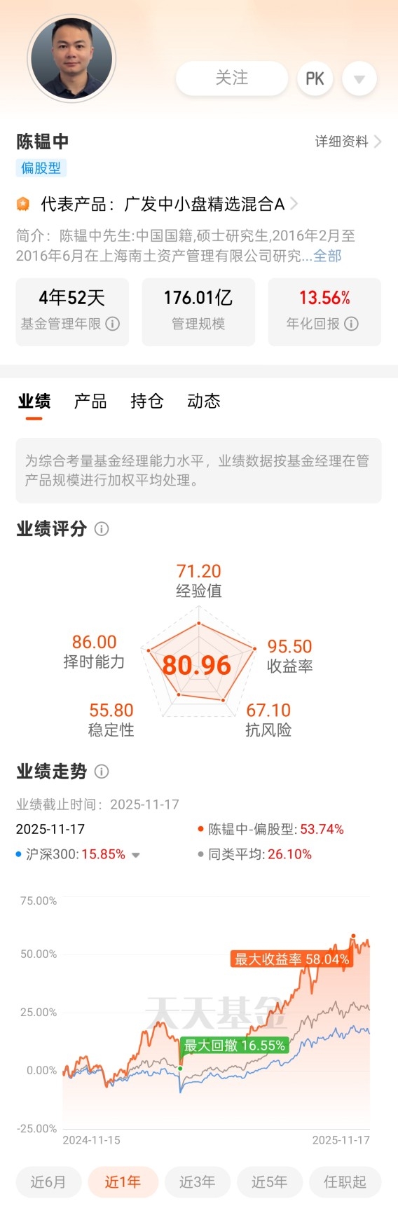 2.从从业经历来看,陈韫中经历多轮市场周期洗礼,对成长行业的周期性波动有着深刻理解。2022-2023年成长行业逆风期,其管理广发基金虽经历较大回撤,但也促使其反思投资策略,逐步形成“成长与非成长行业动态结合”的配置思路,通过周期视角确定行业配置比例,有效提升了组合的抗风险能力。在具体赛道研究中,他展现出前瞻性布局能力,如2019年精准把握半导体行业筑底后的戴维斯双击机会,2022年提前布局当时尚未形成板块效应的机器人赛道,这些经验均已融入广发成长启航的投资决策中。