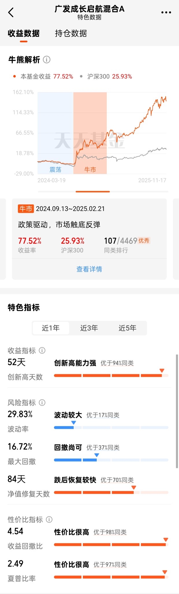 1.从业绩表现来看,该基金业绩突出。广发成长启航基金成立于2024年,聚焦新能源、半导体、AI、军工等成长赛道,截至2025年11月17日,基金成立以来累计收益达142.02%,远超沪深300的28.52%,同类平均的37.06%,且短期业绩突出,近1年收益率75.91%,同类排名前3.35%,夏普比率2.25,显示短期收益风险比表现较优(数据来源:天天基金网),展现出强劲的盈利能力。