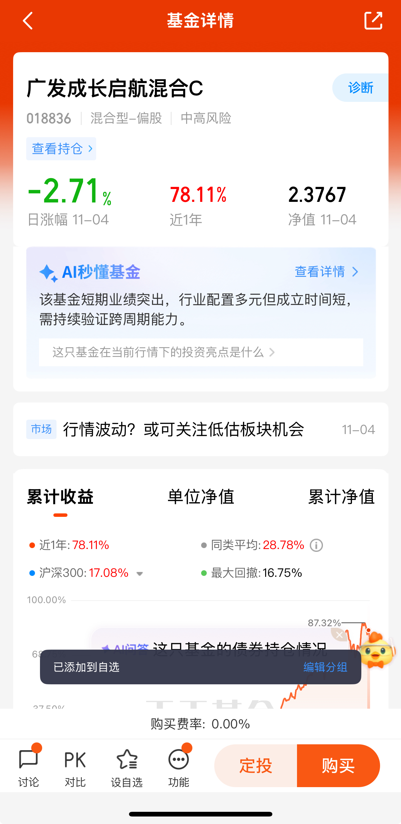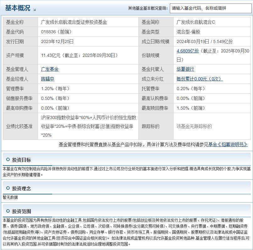 广发成长启航混合C自2024年3月19日成立以来收益相当可观,截至目前已经获利144.85%。今年以来收益75.23%,近3月收益20.81%,近6月收益49.87%,近1年收益70.02%。这亮眼的成绩说明该基金有较强的盈利能力,能为投资者带来不错的回报。就好比你投资了一家业绩持续增长的公司,能看到实实在在的收益增长。