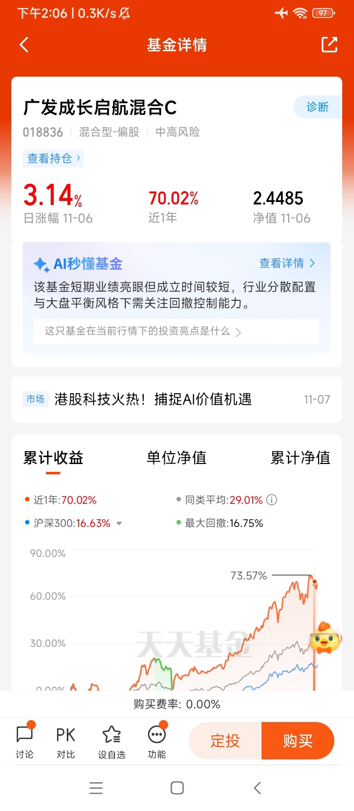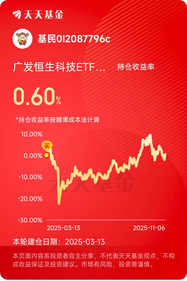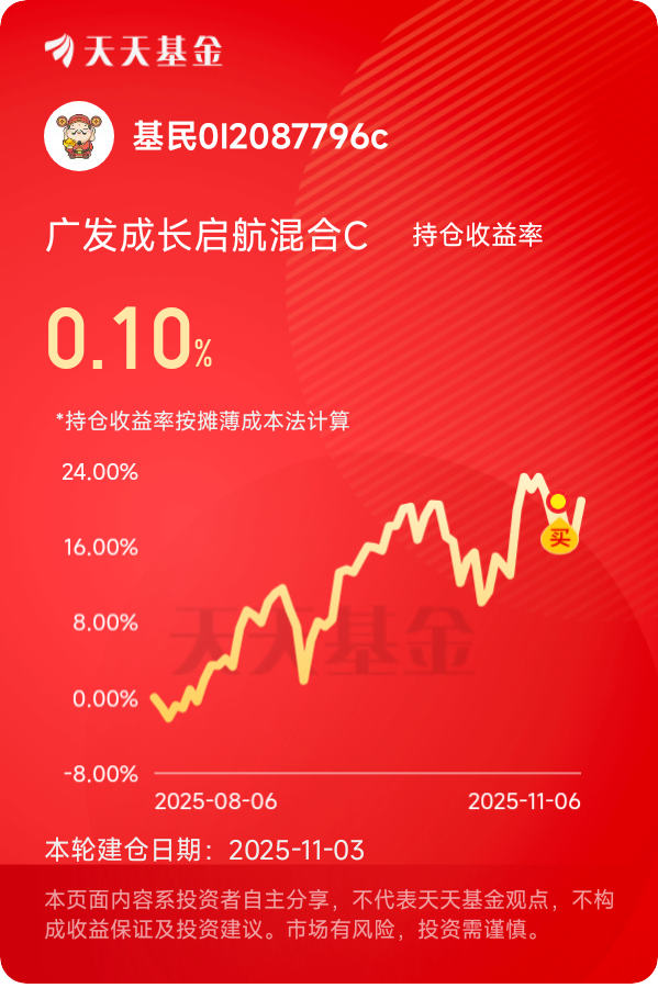 未来,我将继续坚定持有广发成长启航混合C与广发恒生科技ETF联接(QDII)C,并在合适的时点持续加仓。我坚信,在科技产业革命与资本市场改革的时代浪潮中,这两只基金将持续发挥专业优势,精准把握A股、港股科技板块的投资机遇,与广大投资者一同分享科技创新带来的长期成长红利。科技长牛,未来可期,与广发基金并肩同行,定能在成长赛道上收获属于时间的馈赠。@广发基金