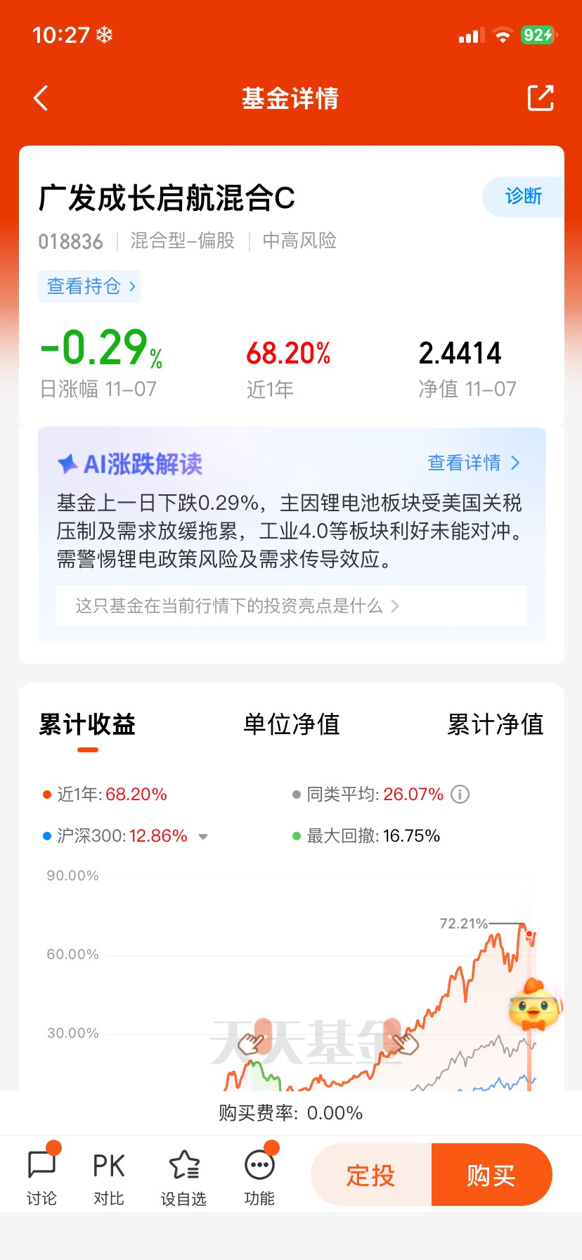 #新兴成长一起投# 立足当下,在我国基本面企稳回升和美国降息的逻辑下,我认为科技板块热度能持续,能够成为贯穿全年的投资主线,因此依然看好后市机会;我会继续定投$广发成长启航混合C$ ,并坚定持有!这只偏股混合型基金精选科技赛道优质公司,今年以来收益率74.72%,在4511只同类基金中排名前5%,业绩表现非常优秀!彰显了广发基金和陈韫中经理超凡能力!