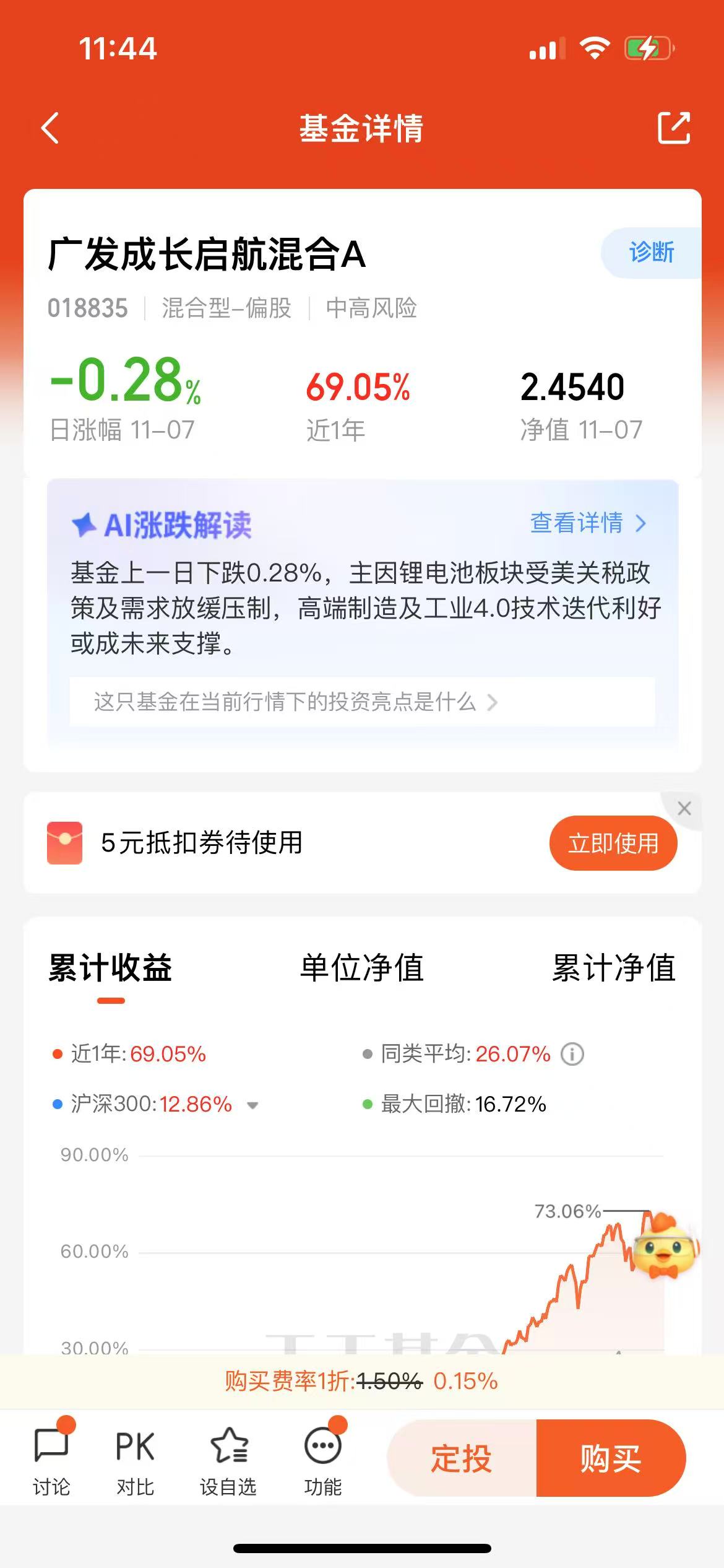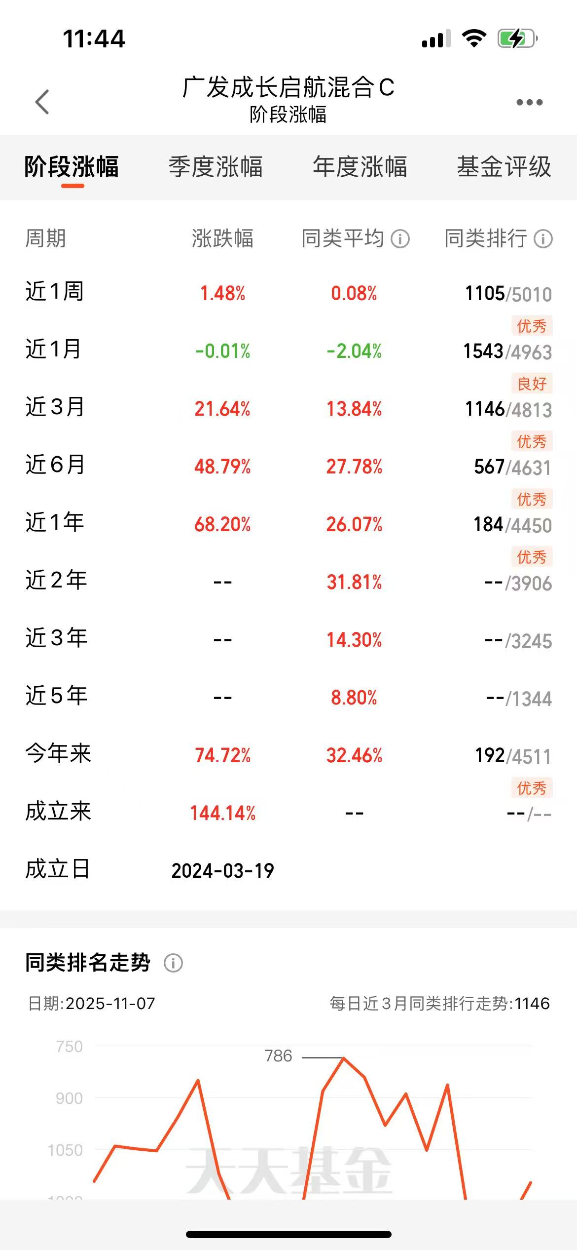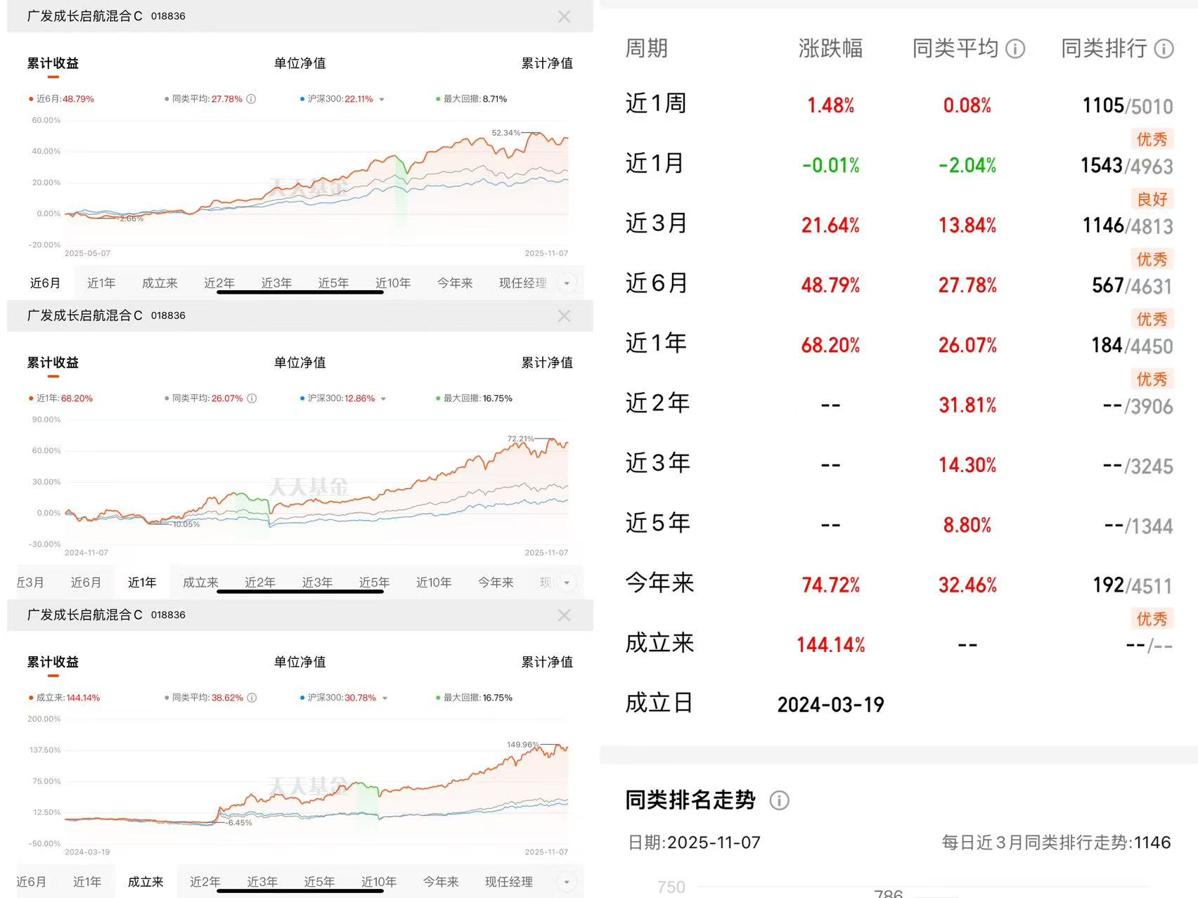 先说说最直观的——这业绩是真能打。这基金去年3月才成立,到现在满打满算也就一年半,成立来收益直接干到144.14%,今年以来也有74.72%,近一年68.20%的收益更是把同类平均的26.07%甩了一大截。你可能会说“新基金业绩好是运气”,但你看它的走势,不是那种一下子冲上天然后暴跌的“过山车”,是稳稳往上爬的——近3月涨21.64%,近6月48.79%,哪怕是市场震荡的近1月,同类都跌了2.04%,它就微跌0.01%,抗跌性肉眼可见。我自己买的那点钱,现在收益比存银行三年定期还多,这能不香吗?