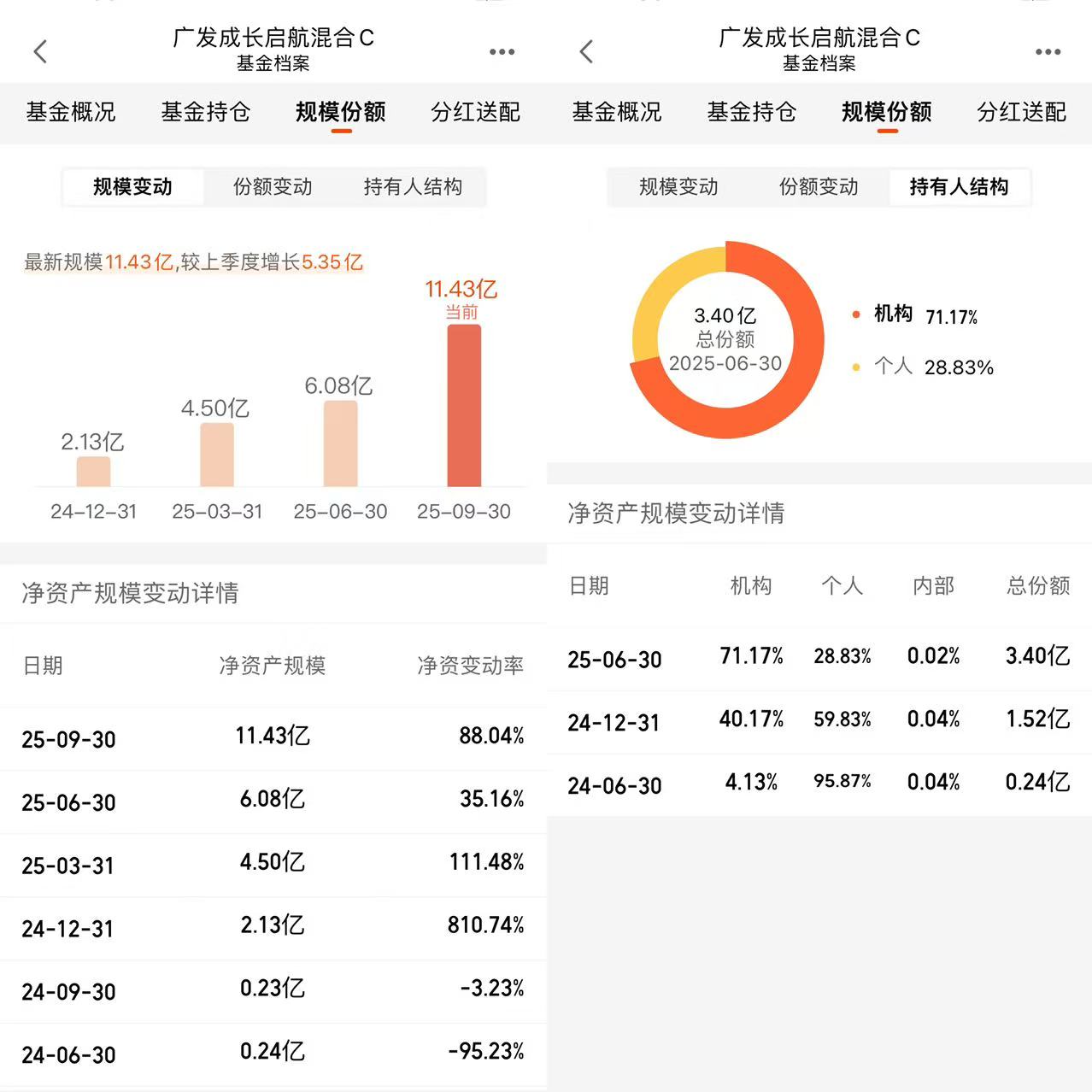对了,它的规模和持有人结构也很健康。现在规模是11.43亿,不算太大——基金规模太大的话,经理调仓会不方便,尤其是买中小盘成长股的时候,容易“买不进、卖不出”,而11亿左右的规模刚好合适,既能买到足够多的优质标的,又能保持调仓的灵活性。再看持有人结构,机构占了71.17%,个人才28.83%——机构投资者可比咱们散户专业多了,他们敢重仓的基金,肯定是经过深度调研、觉得长期有价值的,跟着机构买,心里能踏实不少。
