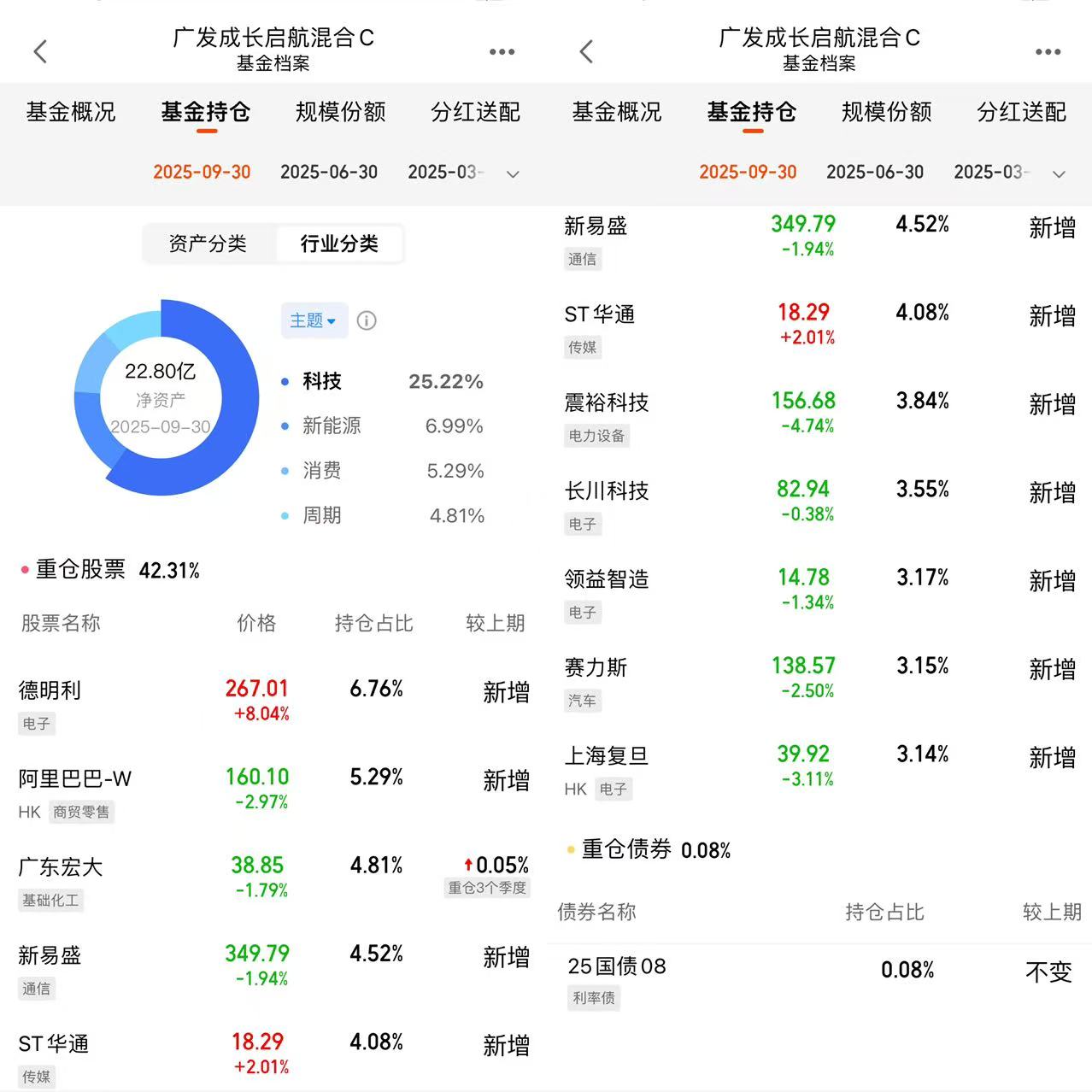 再往深了看,它的持仓逻辑特别对我胃口——不是死磕某一个赛道,而是“科技为主、分散布局”。你看它最新的持仓,电子行业占了16.62%,像德明利(存储芯片)、长川科技(半导体设备)都是现在AI算力爆发的核心标的;但它也没把鸡蛋放一个篮子里,前十大重仓股占比才42.31%,还配了基础化工(广东宏大)、新能源(震裕科技)、互联网(阿里巴巴-W)这些方向。这种布局我觉得特别聪明:一方面抓住了现在最火的科技主线,吃得到产业红利;另一方面又分散了风险,不会因为某一个行业暴雷就亏得底朝天。比如前阵子新能源回调,它因为有科技股撑着,净值也就小跌了点,要是全仓新能源,那可就惨了。