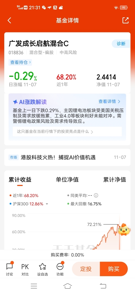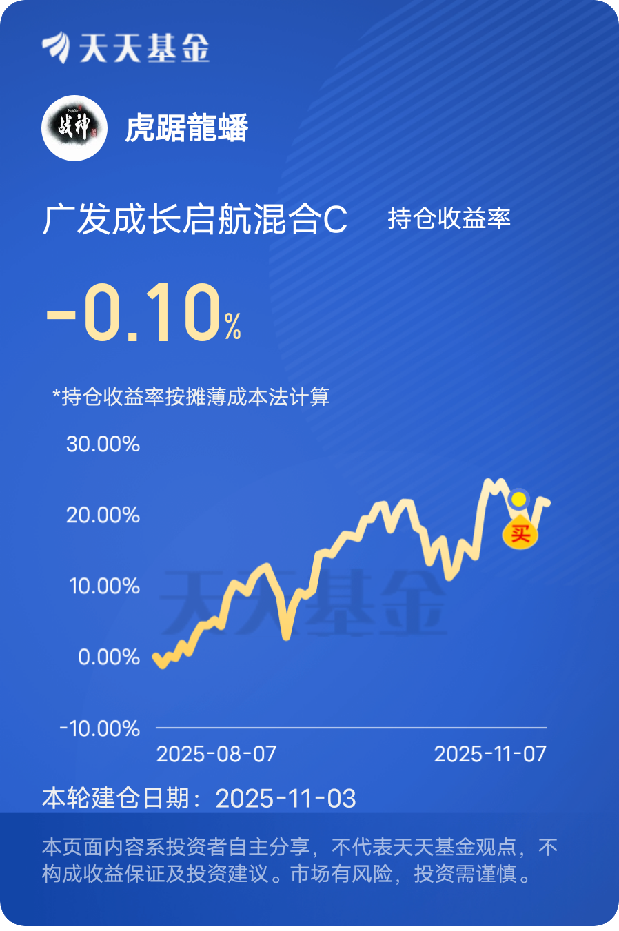 #新兴成长一起投# 基民小虎认为科技板块热度能持续,近期虽然有震荡,后市机会仍可期!咬定科技不放松,任尔东西南北风!已开始定投$广发成长启航混合C$ ,这只基金布局科技赛道,年内上涨74.72%,大幅跑赢同类基金32.46%的平均涨幅,在4511只同类基金中排名前5%,非常优秀!