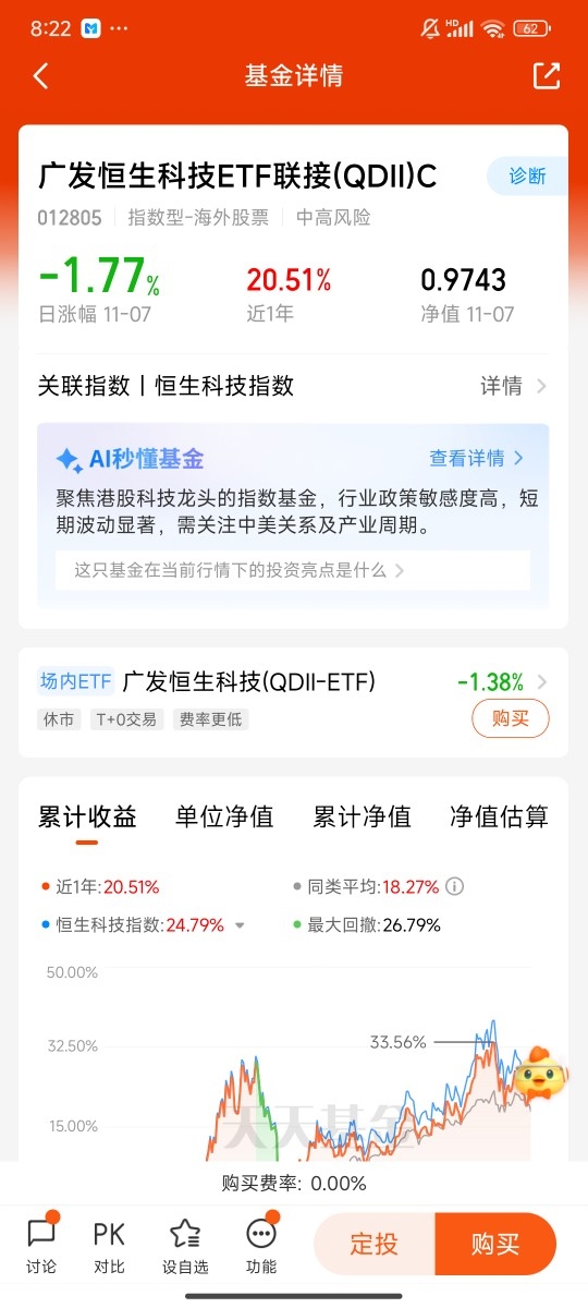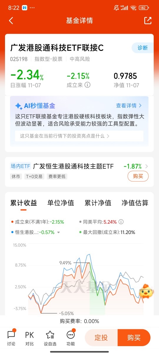 当然,我也知道不能把所有鸡蛋放在一个篮子里。为了分散风险,我还关注了恒生科技和港股通科技相关的基金。港股里的科技企业很多都是行业龙头,估值相对A股更有优势,而且受全球市场影响,能和A股的科技基金形成互补。我已经把广发家相关的几只基金都加入了自选,打算根据市场情况调整仓位,让广发成长起航C和这些基金形成一个有效的投资链条。这样一来,既能抓住科技主线的上涨机会,又能通过分散投资降低风险,提高整体收益的稳定性。