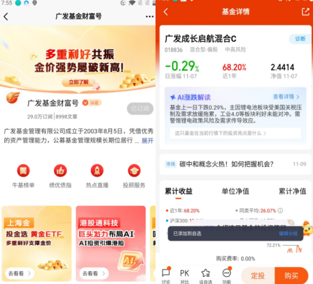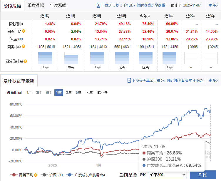 市场波动虽不可避免,但恰为布局提供良机。近期科技板块出现一定程度回调,科创创业50指数估值从高位回落,这种短期调整反而使市场定价更为合理,为下一轮行情积蓄动能。在这种复杂市场环境中,主动管理型基金的优势愈发凸显。以广发成长启航混合为例,该基金近一年累计回报超过69.05%,今年来收益率达75.49%,展现出基金经理在成长投资领域的深度布局能力。该基金由陈韫中管理,可同时投资A股和港股,通过两地市场产业比较,优选性价比更高的科技资产。