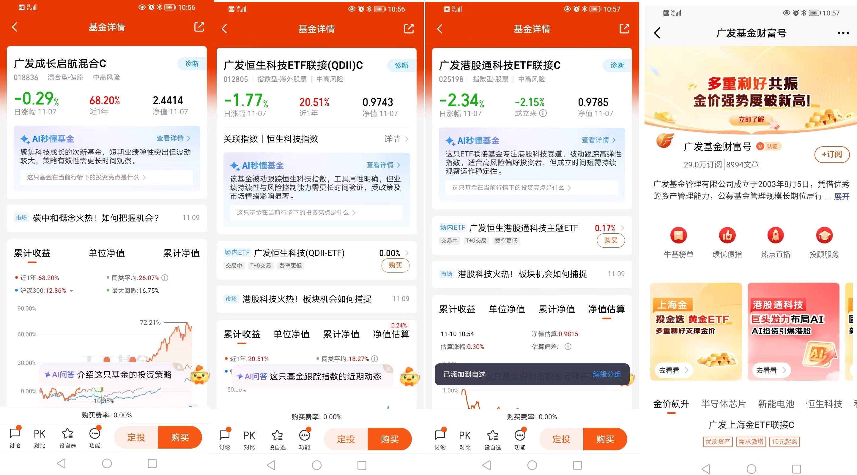 本老太我退休十几年了,别的爱好没有,就痴迷基金投资!这些年买过的基金没有一百也有八十,踩过坑也赚过钱,越投越明白一个道理:选基金就得选靠谱公司、厉害经理、贴合大趋势的!这不,10月以来科技板块震荡,好多人慌了神,但我一点不慌——因为我手里攥着三只“宝贝”:$广发成长启航混合C(OTCFUND|018836)$$广发恒生科技ETF联接(QDII)C(OTCFUND|012805)$$广发港股通科技ETF联接C(OTCFUND|025198)$,这三只基金就像我养老钱的“定海神针”,不仅让我在科技板块前期上涨中赚得盆满钵满,就算现在震荡,我也坚信它们能带着我继续吃肉!今天我就掏心窝子跟大家伙儿说说,为啥我认准这三只基金,为啥科技板块的热度肯定能持续,后市机会到底有多香!