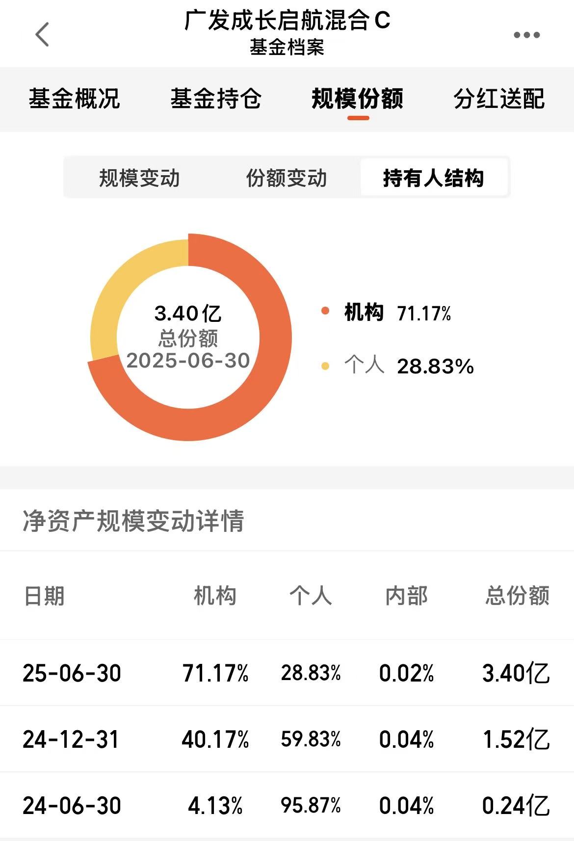 截至今年2季度,持有人结构中,机构占比71.17%,比上期大幅度增加31%,个人占比28.83%,内部占比0.02%;
