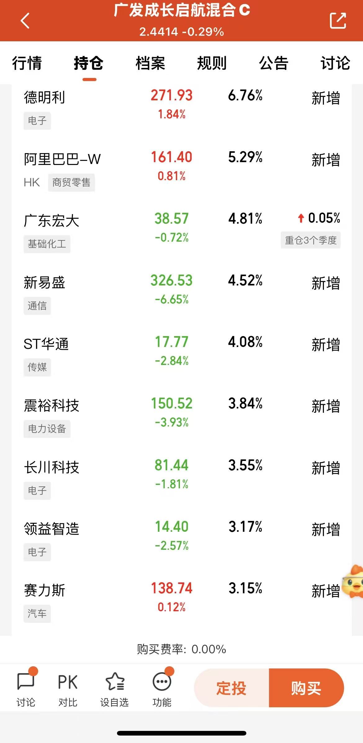 截至3季度重仓个股中,新增德明利、阿里巴巴、新易盛、ST华通、长川科技、赛力斯和上海复旦等,电子行业占比16.62%,商贸零售5.29%,基础化工4.81%;