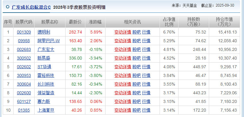 让我们来分析一下2025年第三季度的重仓股,包含的行业有:电子,商贸零售,通信,传媒,电力设备,汽车,基础化工,横跨7个领域,标准的均衡风格。