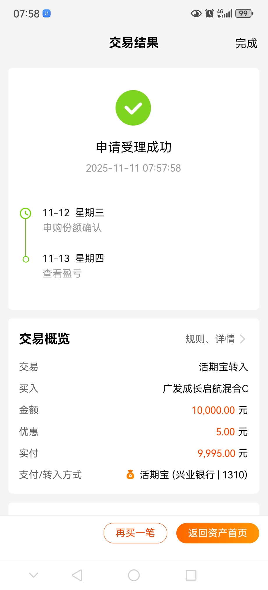 发现并确认了优秀的主动基金,不能只是围观,必须入手,今天先买入10000元。