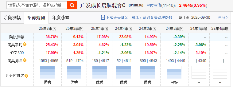 请看上面的数据,广发成长启航混合(A类:018835,C类:018836)在近6个季度,除了一个良好,其他5个全是优秀,业绩全部大幅领先于同类平均。