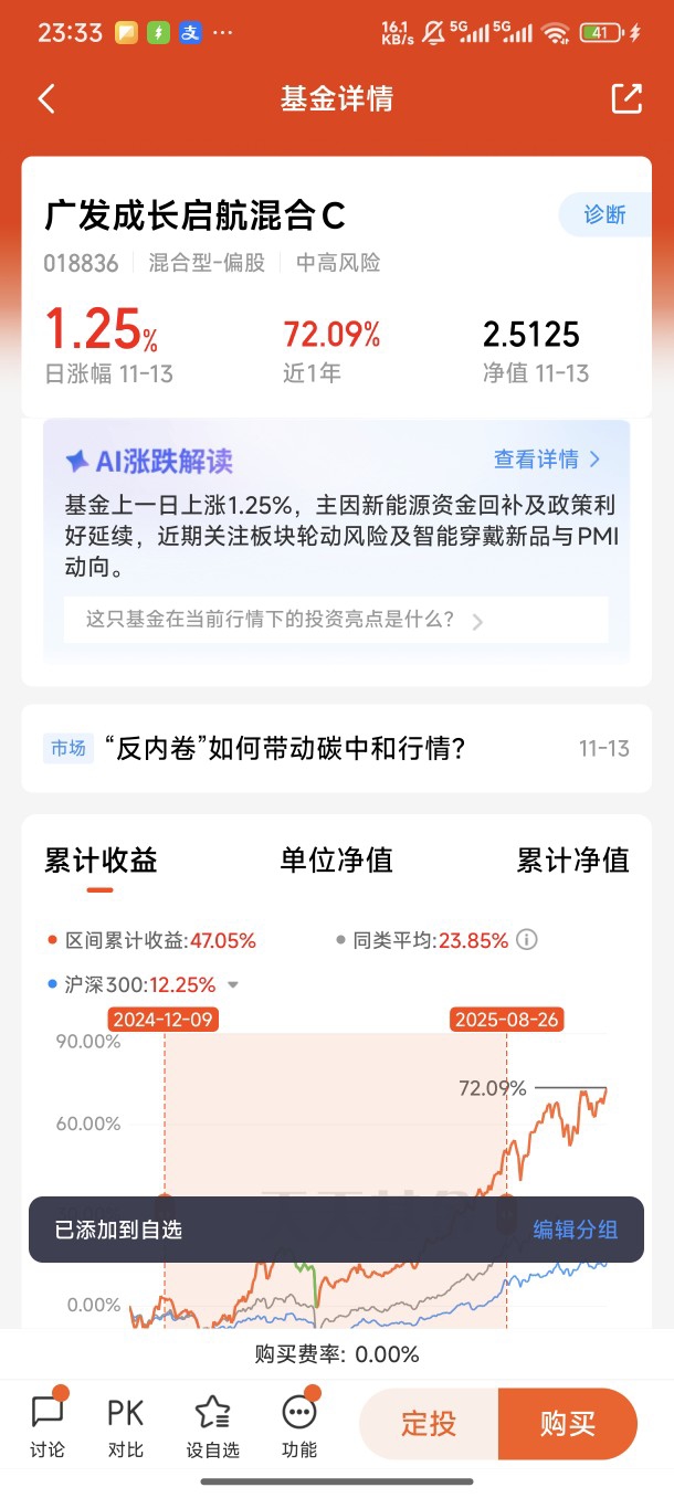 对于普通投资者而言,成长赛道虽潜力巨大,但单一行业波动风险较高,通过广发成长启航C这样的优质基金布局,既能一键覆盖三大高成长赛道,又能借助基金经理的专业择时与选股能力,规避个股选择风险。从操作策略来看,建议采用定投方式参与,利用基金近1个月4.59%的合理波动摊平成本,长期持有分享赛道成长红利。