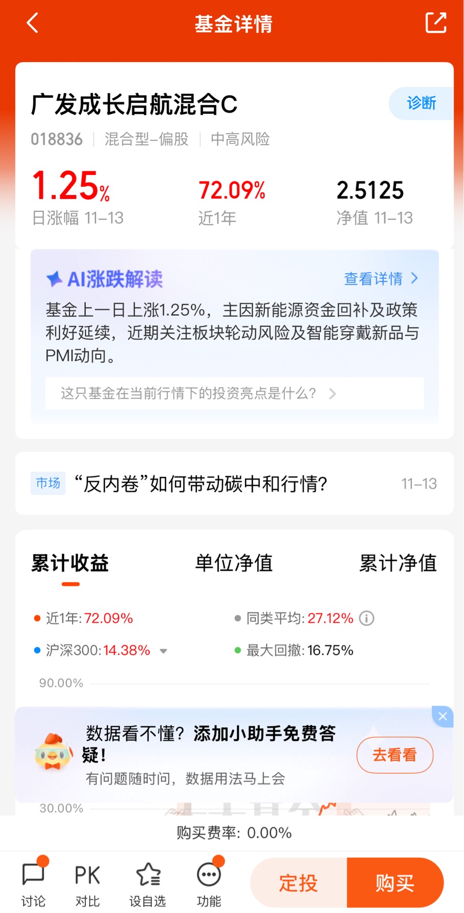 广发成长启航混合 C 自 2024 年 3 月成立以来,收益率表现十分亮眼,截至目前收益率已达 127.36%,这一成绩在同类基金中脱颖而出。近一年收益率为 89.75%,在同类基金中排名前 10%,这样的排名体现了其在市场中的强大竞争力。基金经理陈韫中自 2023 年 12 月管理该基金以来,任职回报高达 136.15%,充分展示了其卓越的投资管理能力。