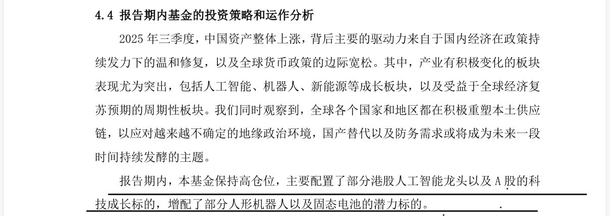 选择一只主动管理型基金,很大程度上就是选基金经理的眼光和定力。所以我个人非常看重基金定期报告里“报告期内基金投资策略和运作分析”这部分,看看基金经理是不是真的说到做到、知行合一。陈韫中经理在广发成长启航混合基金的2025年三季报中就明确写道:“报告期内,本基金保持高仓位,主要配置了部分港股人工智能龙头以及A股的科技成长标的,增配了部分人形机器人以及固态电池的潜力标的。” 这种在波动中坚守核心逻辑,又进行适度调整的管理策略,正是投资AI这种高波动高成长板块所必需的。