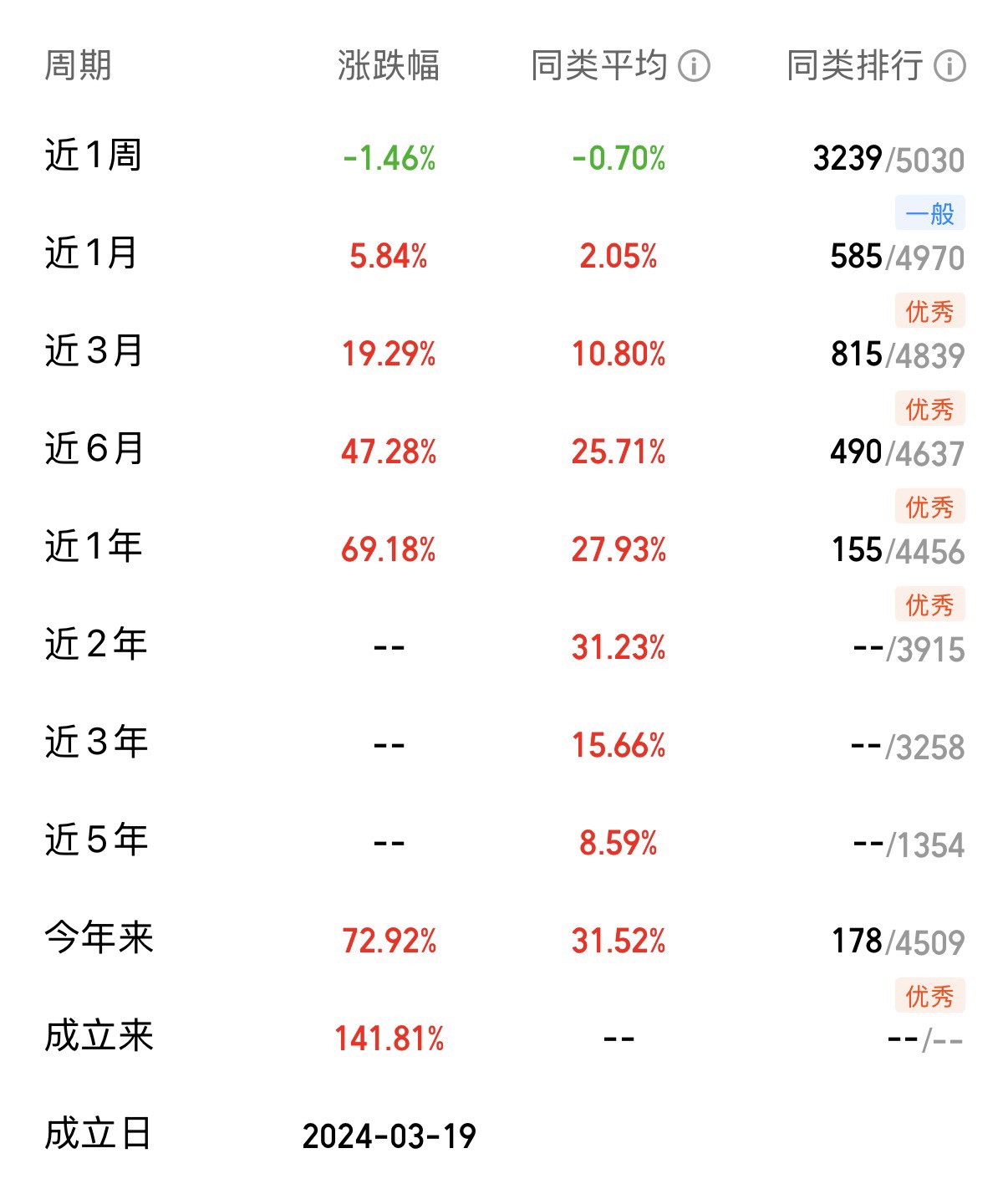 从业绩表现来看,这只基金也确实展现出了主动管理型基金在行业投资上的优势。广发成长启航混合基金自2024年三月份成立以来,一年多的时间,其A类份额累计涨幅竟已高达141.81%,而同期业绩比较基准只涨了26.63%,跑赢业绩比较基准115.18%。从近一年、六个月、三个月的表现来看,涨幅分别为69.18%、47.28%、19.29%,均大幅度跑赢同类平均的27.93%、25.71%、10.80%,同样上超额收益率明显,并且还都位于【优秀】评级!当然,过去表现好不代表未来一定好,但至少说明基金经理在把握科技这条主线上,目前做得还不错。