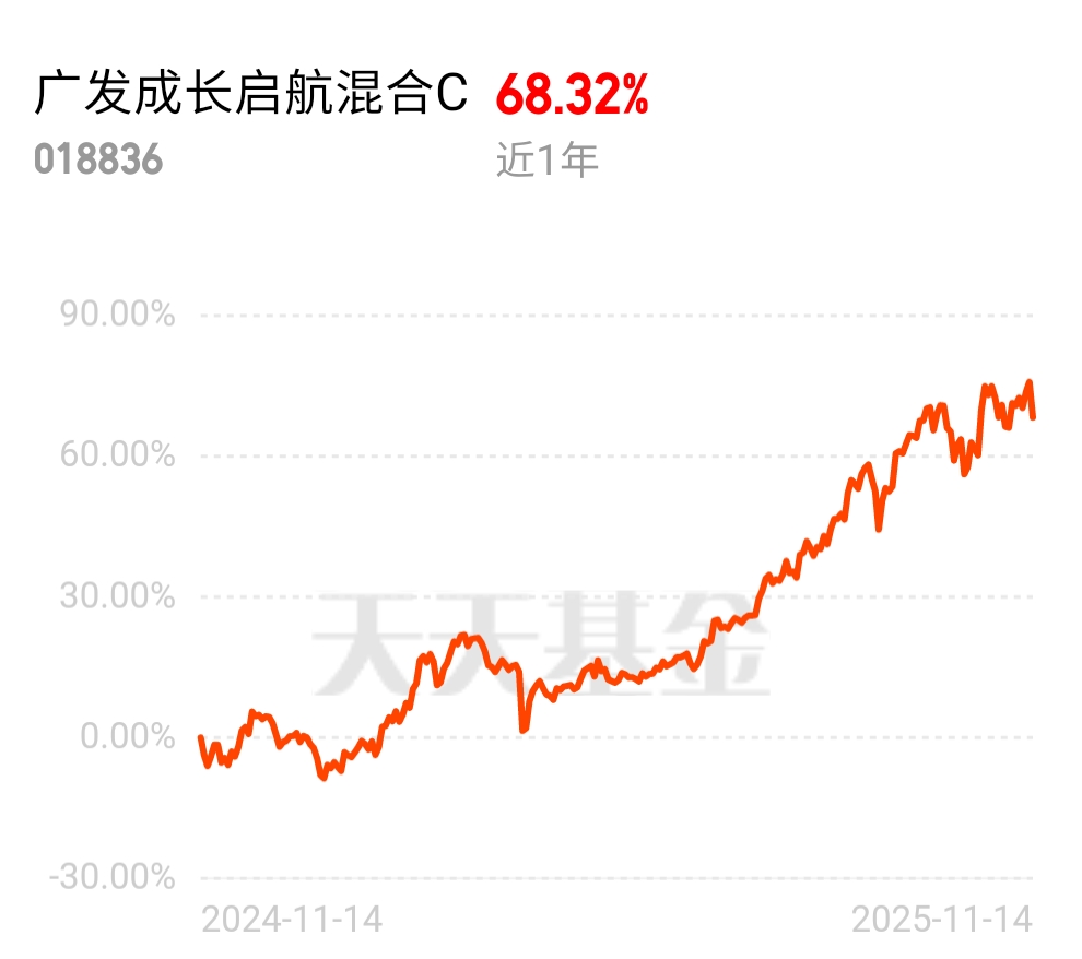 $广发成长启航混合C(018836)$,偏股混合型基金,成立于2024年3月19日,基金规模11.43亿,机构占比71.17%。在1年半多的时间里,收益达到140.55%,今年以来更是高达72.15%,非常优秀。$广发成长启航混合C$