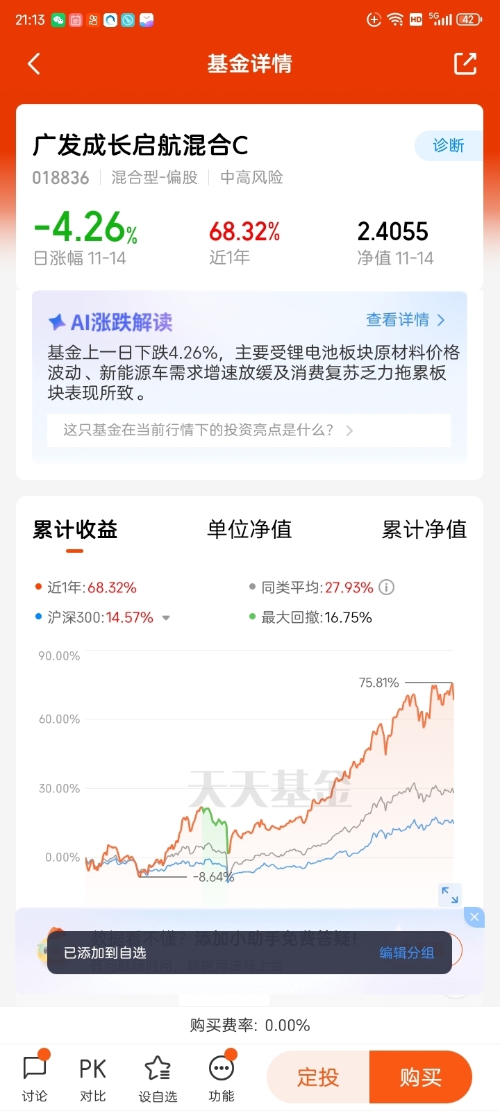 尽管广发成长启航混合 C 成立时间不算久远,但基于基金经理的历史管理能力与当前投资布局,其长期业绩潜力值得期待。参考陈韫中过往的投研成果,他管理的相关产品在成长赛道布局中,均展现出 “收益稳健、回撤可控” 的特点,尤其是在行业周期切换过程中,凭借精准的仓位调整与标的选择,实现了超越同类的表现。