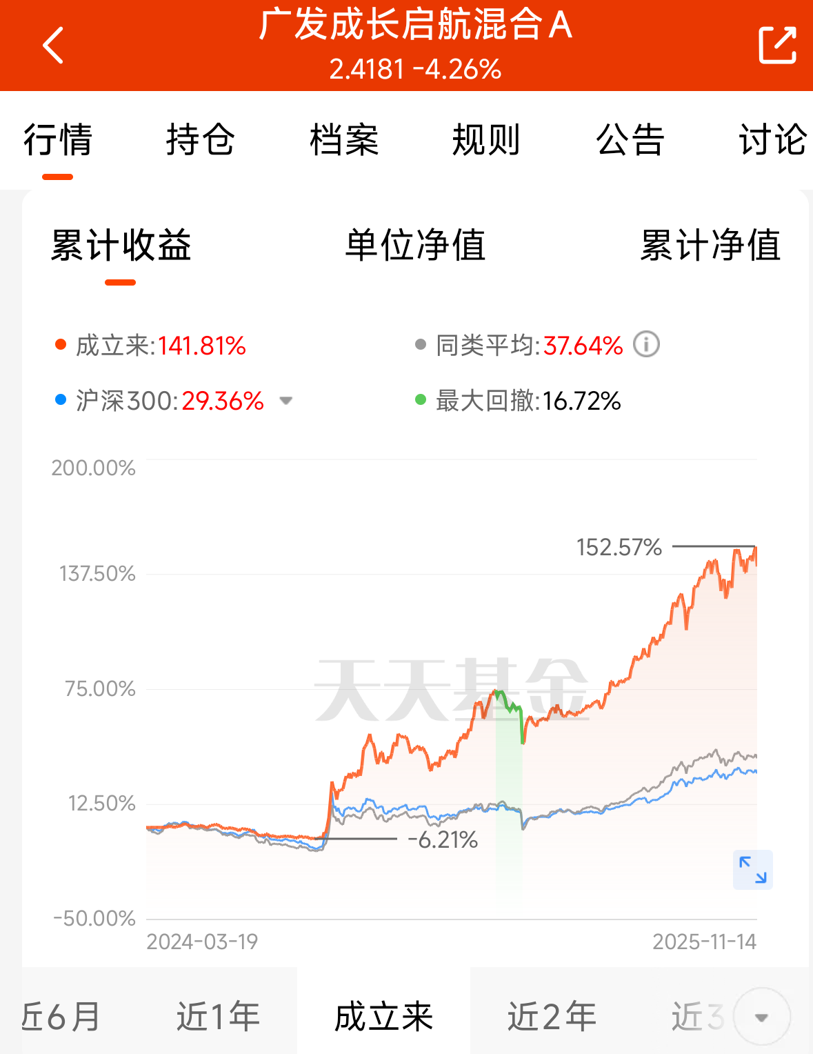 广发陈韫中,在管产品业绩亮眼的是广发成长启航,发行的时间点是出奇的好,2024年3月19日,成立以来业绩152.57%,基本没有大的回撤,今年以来72.92%,表现非常优秀。