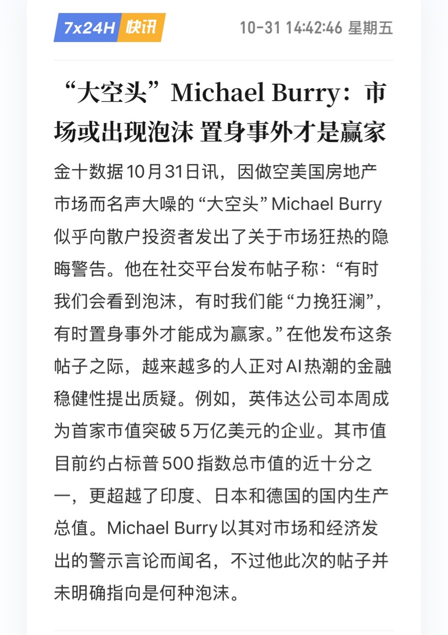 接下来聊聊海外吵翻天的“AI泡沫”争论。这事儿挺有意思,让人忍不住想起上世纪90年代的互联网泡沫。历史总是惊人相似:1990-1994年浏览器普及打基础,1995-1998年商业化催生行情,1999-2000年市场狂热潮估值乱飞,最后泡沫破灭,纳斯达克三年跌了78%,一堆公司破产消失。但现在呢?我觉得还不能简单说AI泡沫要爆了。一方面,对比历史,本轮AI行情和互联网泡沫初期很像——宏观流动性宽松、政策支持强,虽然特朗普政策的不确定性和美元信用问题让美股吸引力下降,但关键引爆点还没出现。比如,互联网泡沫破灭是因为流动性收紧和盈利证伪,可现在呢?科技巨头业绩依然强劲,像英伟达的Blackwell芯片订单“爆表”,高估值还有盈利撑着;资本开支扩张也有真实需求支持,不像当年那样纯烧钱,目前美股前十大公司资本开支占现金流比例才46%,远低于互联网泡沫时的75%,财务还算健康。 另一方面,争论焦点在AI投入能不能赚回钱。有些大佬在唱空,比如“大空头”原型Michael Burry直接做空英伟达,软银也清仓套现;专家如西格尔警告数据中心投资回报率可能低于预期,企业花几十亿美元可能打水漂。但高盛等机构反驳说AI估值合理,未到泡沫阶段,理由是全球增长真实、资金流入稳定。综合来看,AI行情确实有点泡沫苗头,但远没到狂热期,更像早期阶段。泡沫争论升温,反倒可能帮市场挤掉水分,给后续行情留出空间。说白了,现在吵归吵,但AI产业趋势还在半山腰呢,别急着喊崩盘。