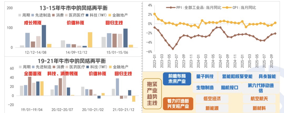 最后说说这波风格切换和AI行情的未来节奏。短期看,风格切换是真事儿,但大概率只是牛市“中场休息”,科技主线迟早要回来。参考历史,比如2012-2015年或2019-2021年的牛市,中期常有价值股补涨的再平衡阶段。现在科技股调整,是因为交易拥挤、估值高、泡沫担忧,而白酒、地产这些“老经济”板块估值低、机构配置少、预期改善,性价比凸显;加上PPI数据超预期,周期板块也借机补涨。但顺周期逻辑有短板,比如通胀修复能不能持续,得等明年年中才见分晓,短期只能盯着真正涨价品类。中长期看,科技仍是绝对主线,核心驱动力是“新质生产力”下的创新浪潮——人工智能、半导体、新能源这些赛道,产业趋势和政策支持明摆着,想象空间巨大。结构上,AI行情可能从硬件转向应用。海外资本开支还在扩张,AI渗透率低,大波段才刚开始;参考美股,AI应用公司2024年扭亏为盈后股价就起飞了。国内呢,上游AI算力今年涨太多,业绩虽稳但空间有限;好消息是中国多模态模型在性能、价格上逼近全球巨头,应用优化是顺理成章的事。不过,切换时间点得等条件成熟:一是国内AI硬件自主可控,二是海外AI应用商业模式更明朗。 核心焦虑还是AI投入的回报问题——如果明年北美云厂商资本开支放缓,或者应用进步不够快,AI主线可能中线调整。2026年还是要盯紧几个关键点:AI眼镜、人形机器人、AI医疗这些垂类应用表现,以及国内互联网公司的商业化成果。如果这些落地顺利,AI新一轮行情就能引爆。