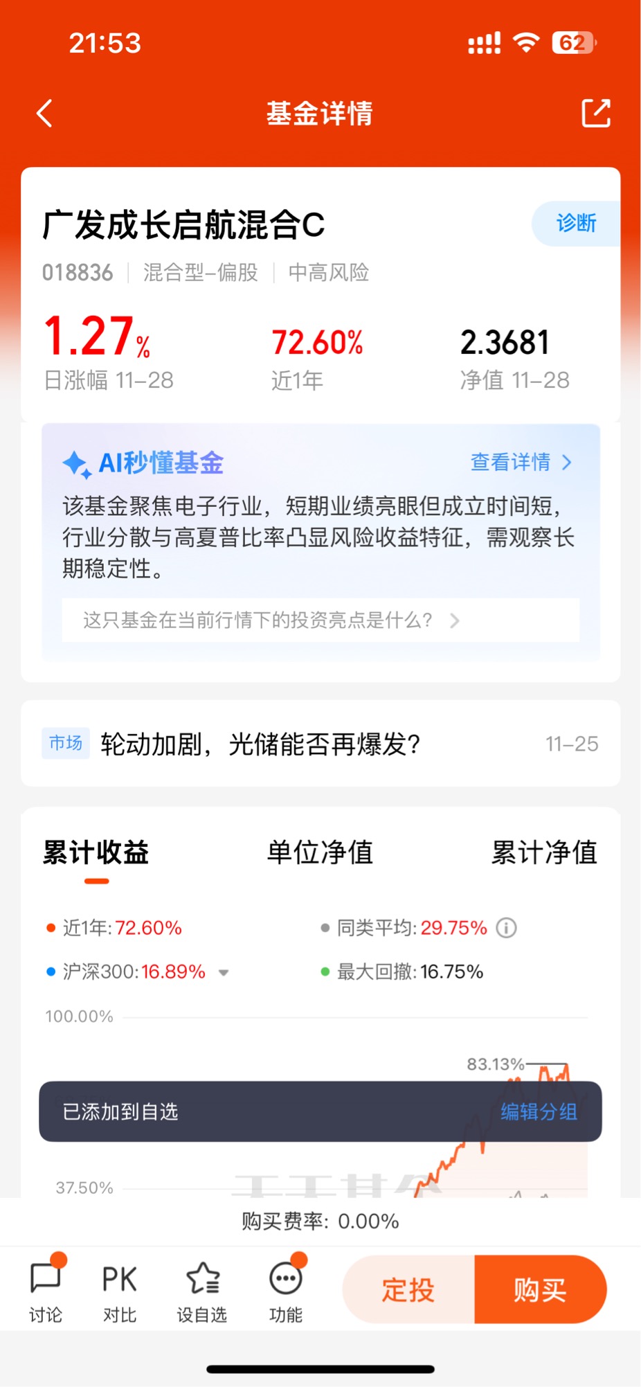 产品的业绩表现印证了其平衡实力。成立以来净值回报达132.72%,近12个月涨幅超70%,大幅跑赢业绩比较基准的17.34%,同时展现出较强的风险韧性,近1个月4%左右的回撤在成长类基金中处于合理水平。这种“高收益低波动”的特征,得益于基金灵活的仓位管理——股票资产占比可在60%-95%之间调整,行情向好时加大成长股配置,波动加剧时适度降仓,搭配电子、通信、新能源等多赛道均衡布局,避免单一行业集中风险。