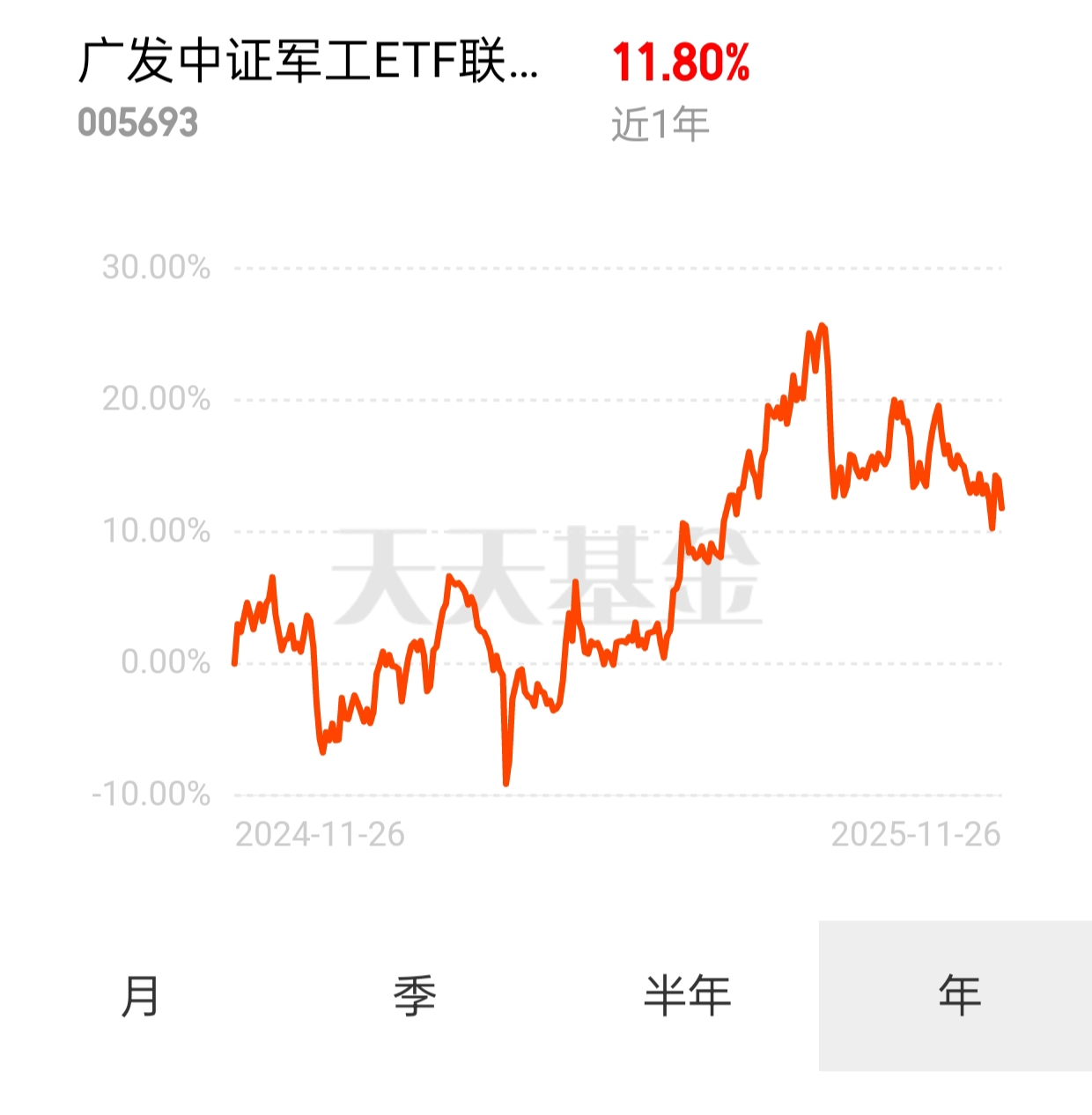 国家航天局相关行动计划明确到2027年基本实现商业航天高质量发展,并设立国家商业航天发展基金,引导资本坚持做长期投资、战略投资、价值投资。这只$广发中证军工ETF联接C$(005693)跟踪中证军工指数,上周五涨了1.22%,这基精准覆盖航空航天、兵器装备、船舶制造三大关键主线,能更好的把握板块行情#12月基金投资策略#