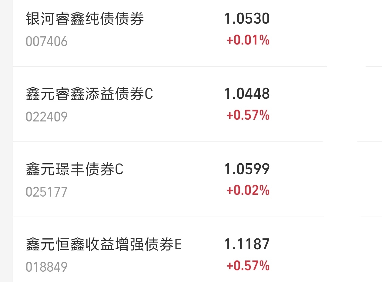 真不错,今日债区又收了大蛋。其实,我今天吃到了肉,能收到这么多大蛋,心情还是比较好。这两日,这个$鑫元恒鑫收益增强债券型发起式E$ 表现很好,今晚收了57个蛋。我觉得,每日有蛋收,就很不错啦。今晚开心,去外面吃夜宵了。$鑫元睿鑫添益债券C$ 也收了57个蛋,继续看好啦。$鑫元璟丰债券C$ 比较稳,收了2个蛋