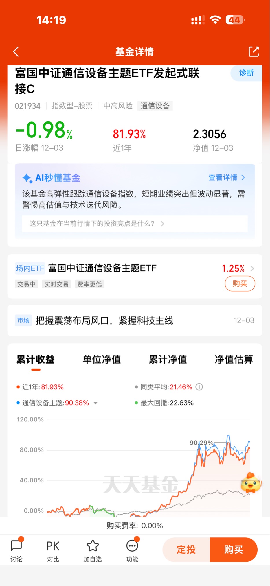 目前消费电子那边没啥动静,转头看了看富国中证通信设备主题ETF联接C,近1周涨2