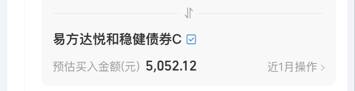 $易方达悦和稳健债券C$ +5K,债市今年还是比较难,赚钱效应没有以前那么好了,大盘行情不错,但是股基遇上回调容易拿不住,我自己是偏稳健理财的,继续配置一点固收+吧,我觉得还是比较贴合最近的行情。今天补仓一笔易方达悦和稳健债券C,它是一只中波固收+,持仓大头是债为主,少量权益在大盘好的时候获取更好的收益,风格上稳中有进,近一月收蛋89个,拉长业绩看近一年上涨了6.43%,跑赢大部分同策略固收+,趁着有行情再补一点仓位。