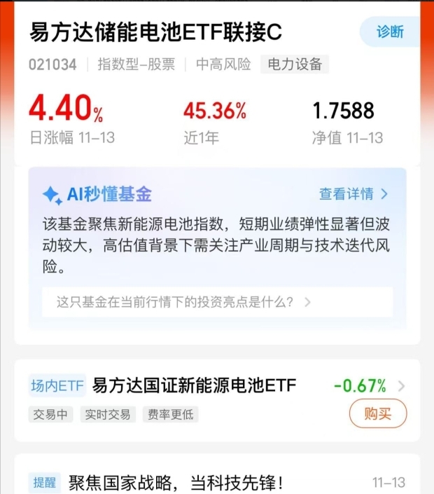我来这边看看鼎益的走势。我自己的一个小账户专门做赛道投资,最近就特别看好国证电池指数,因为它储能占比高,方向特别明确。中证那个覆盖的面太广了,不够聚焦,还是这个纯粹,要弹性和趋势的时候,还是得选这种细分赛道指数。$易方达储能电池ETF联接C$