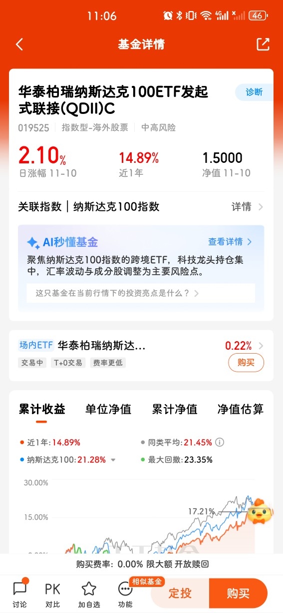 今天特意看了下纳斯达克的行情,虽然短期有点震荡,但整体还是保持着向上的趋势,长期来看依然是靠谱的方向。反观咱们A股,近期波动实在太大,有时候明明看着要涨,结果转眼就跌了,实在让人没安全感。这时候配置点海外资产就很有必要了,能有效分散风险。我研究了一圈,觉得华泰柏瑞的产品很对胃口,它的纳指相关额度挺高的,不用担心买不上,而且单日能买500,想多投点或者慢慢加仓都灵活。对于想避开A股波动、布局长期稳健收益的朋友来说,这款产品真的可以重点关注,毕竟把鸡蛋放在不同篮子里才安心。